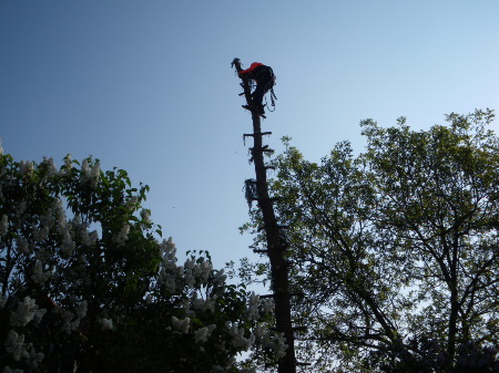 Wir arbeiten bei schwierige Bäumfällungen mit zertifizierter Seilklettertechnik und sind daher mit professionellen Equipment ausgestattet.